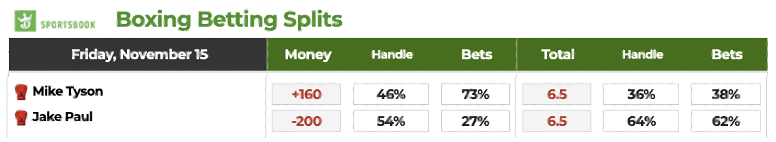 On Thursdayโs VSiN PrimeTime with Tim Murray, Circa owner Derek Stevens said the money was coming in hot on Tyson. That syncs with what we are seeing in the DraftKings splits with 73 percent of the bets on the former champion.