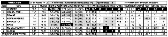 If you’re looking for who should win this tournament, it’s definitely Vermont. They’re the oddsmakers’ favorite for a reason. As I mentioned, I’ve got them power-rated 4.5 points higher than the next best team, U Mass Lowell. I couldn’t justify laying -290 on them, though, so if you’re looking to invest in this conference, I think U Mass Lowell at +370 is a way better value play.