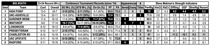UNC Asheville was second in adjusted offensive efficiency and tops in adjusted defensive efficiency in league play, with Winthrop a very close second on defense. As it stands, High Point would have to go through Winthrop in the semifinals, barring an Eagles slip-up against Longwood.