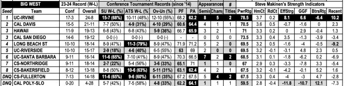 UC Santa Barbara won the conference tournament as the No. 2 seed a year ago. The second-seeded team this week is UC Davis, which finished 14-6 in league play and split two games with Irvine in January. The Anteaters won the first meeting 74-71 in overtime, and the Aggies took the rematch 54-52.