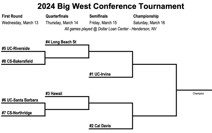 The 2024 Big West Conference Tournament format changes a little this year as the top two seeds in each bracket receive double-byes into the Friday semifinals. The No. 3 (Hawaii) and No. 4 (Long Beach State) seeds receive byes into Thursday’s quarterfinals. Cal State Fullerton and Cal Poly, which went 0-20 in league games, did not qualify for the tournament field.