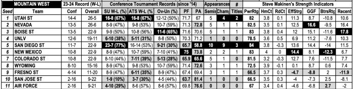 Nevada would seem to be the real darkhorse though. The Wolf Pack started conference play with a 3-4 record. However, they finished 10-1 SU/9-2 ATS in their last 11 games. Over their last 10 contests BartTorvik ranks them 16th in the country in its power rating metric.
