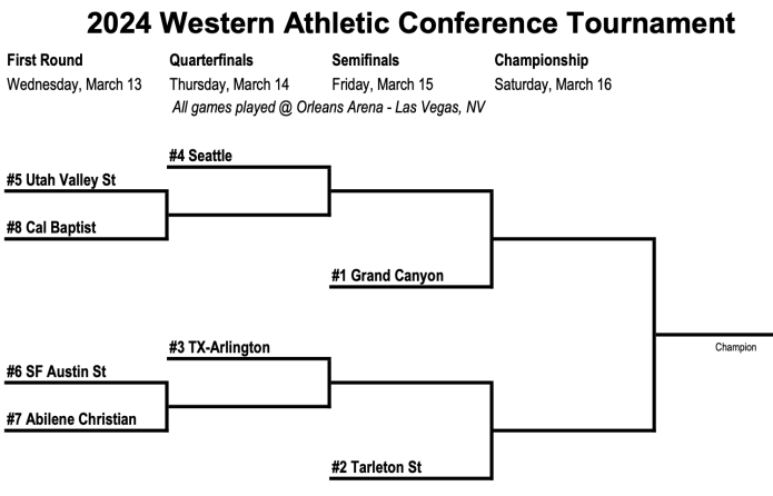 The WAC tournament has a double-bye format, meaning Grand Canyon and Tarleton State have byes to the semi-finals, while Seattle and UT Arlington are both slotted into the quarters. Only the top eight teams in the conference qualified to play at Orleans Arena in Las Vegas.Â