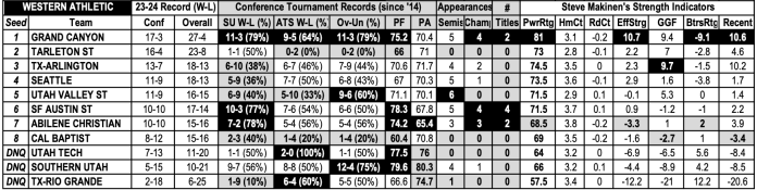 I have this Grand Canyon team power-rated right around middle-of-the-road Power Six conference teams, so do not sleep on them in this tournament and beyond. While this is a one-bid league, with Tarleton State ineligible to dance, Grand Canyon would advance to March Madness if Tarleton wins.