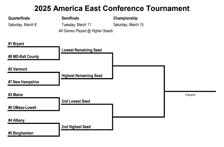 Eight of the nine America East Conference members will play in the postseason tournament, as NJIT finished in last place. One bid to the NCAA Tournament will be up for grabs here in a conference that has been dominated by Vermont, as the Catamounts have won five of the last seven AEC Tournaments and each of the last three.