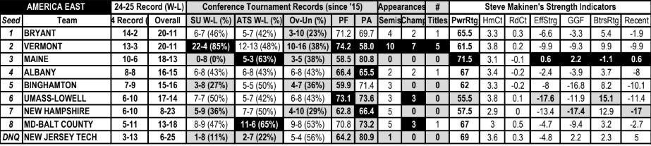 - Small favorites of -4.5 points or less are 15-4 SU and 14-5 ATS (73.7%) in the America East tournament since 2015.