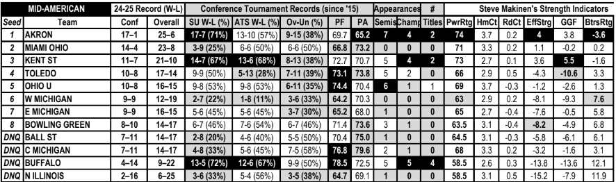 Heading into the tournament, Akron is a top-100 team for both Bart Torvik and KenPom. Rival Kent State is the second-best team in the conference and Miami is another tier below that. The biggest surprise in the MAC this year for me has been how much Toledo has fallen off. We’ll see if they can get it together at a big price in Cleveland.