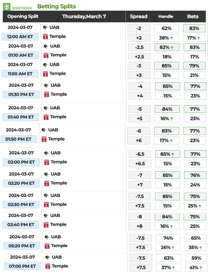 As you can see from the chart below, the line at DraftKings Sportsbook moved from UAB -2.5 to -3 at 11:50 a.m ET and was at -8 by 2:40 p.m. before closing at -7.5 by the 7 p.m. tipoff. UAB beat host Temple 100-72.