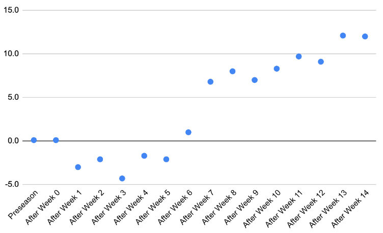 Above, you’ll see the Hokies’ TSI rating as it fluctuated throughout the season. VT started just 1-3, with losses to Rutgers, Marshall and Purdue, but then you can see the power rating really begin to linearly ascend from that point on. Why?