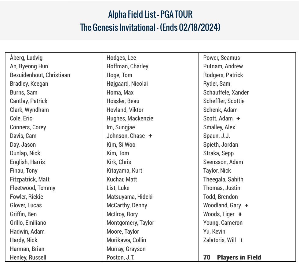With the field capped at a potential 80 players, only 70 actually qualified through the assortment of categories as set forth by the tour. This includes the top 50 in last season’s FedExCup standings, the Aon Next 10 (which for this event is Nos. 51-60 in the final FedExCup Fall standings) and the Aon Swing 5 (the top points earners not already exempt from the previous four Full-Field events). There are also five sponsor exemptions into the field, Adam Scott, Gary Woodland, Will Zalatoris, Chase Johnson (Charlie Sifford Memorial Exemption) and the aforementioned Woods.