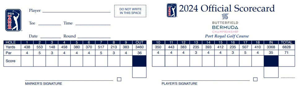 The track, owned and operated by the Bermuda government, is the shortest course on the PGA TOUR at a Par 71 of 6,828 yards. Half of the holes (1-6, 11-13) are played away from the coast and the other half (7-10, 14-18) are played at the seaside. Port Royal is predominantly constructed of TifEagle Bermudagrass (it is in Bermuda after all) on the fairways (rough only about 2″) and greens (average 8,000 sq ft – 3rd largest on TOUR and a slow 10 on the stimpmeter). Players have mentioned El Camaleon (Mayakoba Golf Classic) and the Plantation Course at Kapalua (Sentry TofC) as similar courses mainly for the undulations.