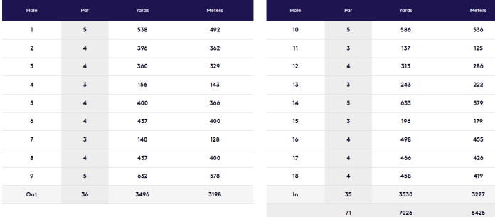 The combined card adds up to a par-71 of 7,026 yards with the Sky 9 featuring more trees and water whereas the Sand 9 is a more exposed heathland. Bunkering is extensive on both nines, both flanking many of the fairways and protecting the bentgrass greens, which have many tricky undulations.