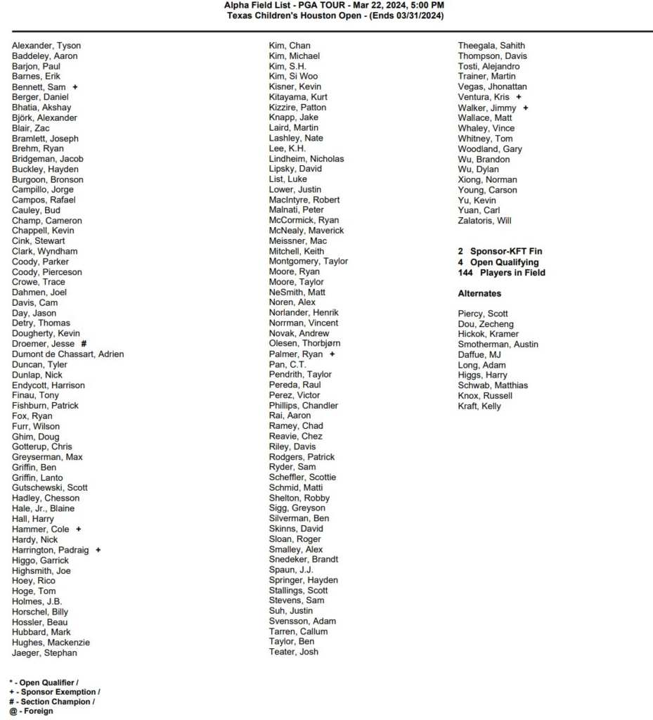 Sahith Theegala (22-1) comes into this week with consecutive top-10 finishes at the Arnold Palmer and The Players and is playing an ex-officio home game this week as he is a Houston resident.