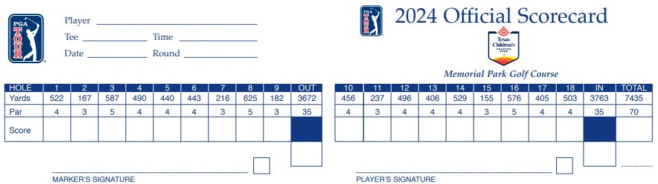 Memorial Park plays as a par-70 (five par-3s, three par-5s, 10 par-4s) of 7,435 yards. Doak removed many trees, bunkers (only 21 on the course, the fewest of any course on the PGA Tour) and water (only in play on four holes) to make it more playable to the public as there are around 55,000 rounds played at Memorial Park in a calendar year.
