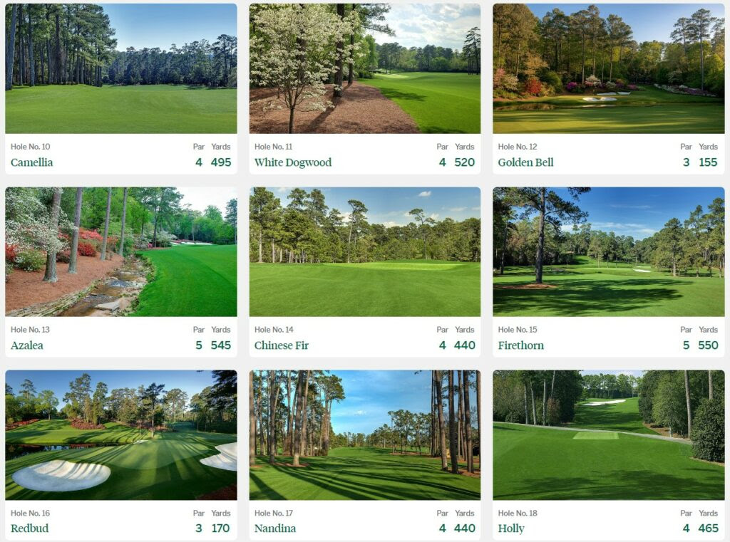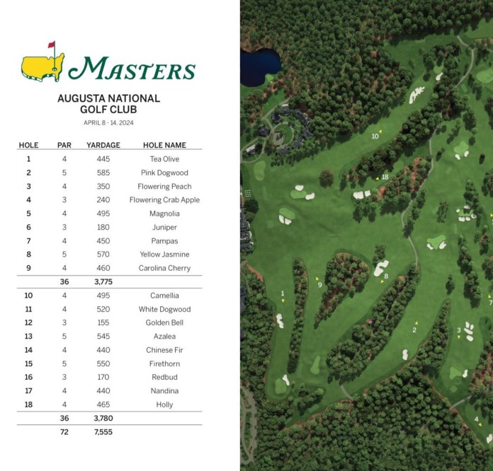 Augusta National Golf Club in Augusta, Ga., was designed in 1933 by Alister MacKenzie and Bobby Jones. It is a par-72 of 7,555 yards (seventh longest on tour) that plays longer than its listed yardage. The average round score last year was +0.95 over par (fifth toughest on tour). Augusta National usually plays to its standard firm and fast conditions. It is a classical, undulating meadowlands track. Water is in play on four holes. The wide (51 yards average — widest on PGA Tour) fairways are Overseeded Perennial Ryegrass with Bermudagrass base. The rough isn’t very thick (1.38 inches), but there are trees and pine straws that provide obstacles after errant tee shots.