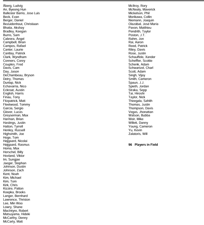 Corey Conners (20), Jason Day (20), Nick Dunlap (20), Lucas Glover (20), Max Greyserman (20), Rasmus Højgaard, Tom Kim (20), Denny McCarthy (20)