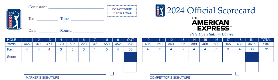 The PGA West Stadium Course is played by each player in one of the three early rounds and then on Sunday. The track was designed by the legendary Pete Dye in 1986. It is a par-72 of 7,187 yards (10th shortest on tour) and usually plays between 1-2 strokes harder than the Nicklaus and La Quinta courses. Water is in play on seven holes and there are 90 bunkers (sixth most on tour). Bermudagrass with Ryegrass comprise the fairways and rough while the greens feature TifDwarf Bermudagrass. However, the Bermudagrass is dormant and the fairways and rough will predominantly be overseeded Rye. The greens, at an average of 5,000 square feet (fifth smallest on tour), will also be overseeded Poa trivialis and run at an average speed of 11.5 on the stimpmeter.