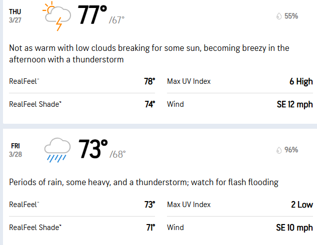 Courtesy of AccuWeather, the worst of the conditions look to be on Friday, so expect some delays in play for Round 2.