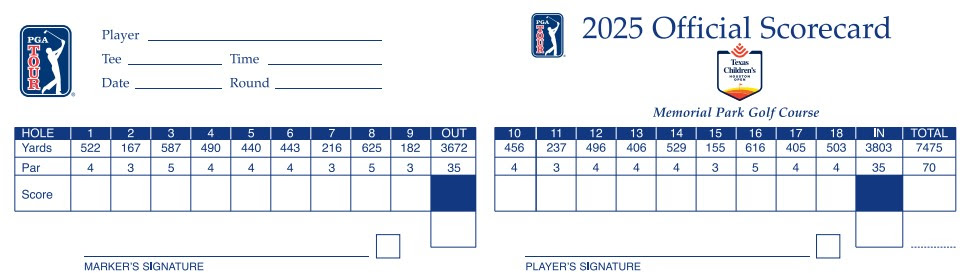 Memorial Park plays as a par-70 (five par-3s, three par-5s, 10 par-4s) of 7,435 yards. Aside from Torrey Pines, Memorial Park is the second-longest non-major course on the PGA Tour. Doak removed many trees, bunkers (only 21 on the course — fewest of any course on the PGA Tour) and water (only in play on four holes) to make it more playable to the public as around 55,000 rounds are played at Memorial Park in a calendar year.