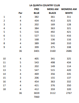 La Quinta Country Club is the third of three courses at The American Express. It is a private course designed by Lawrence Hughes, which opened in 1959 and was redesigned by Damian Pascuzzo in 1999. La Quinta is also a par-72 and the shortest (sixth shortest on tour) of the three courses at 7,060 yards. Water is in play on seven holes and there are 82 bunkers. Like the other courses in the rotation, Bermuda is the primary surface for this course; however, it is dormant and overseeded with Ryegrass in the fairways and rough and Poa trivialis on the greens. The greens, which roll 11 on the stimpmeter, are the fourth smallest on tour at an average of 4,773 square feet.