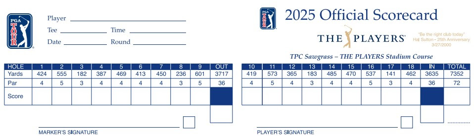 The track is a par-72 of 7,352 yards, lengthened by 77 yards this year. The layout features 92 Scottish-style bunkers (fifth most on tour), 16 water holes (most on tour), including the famous island green on the 17th and a variety of waste areas.