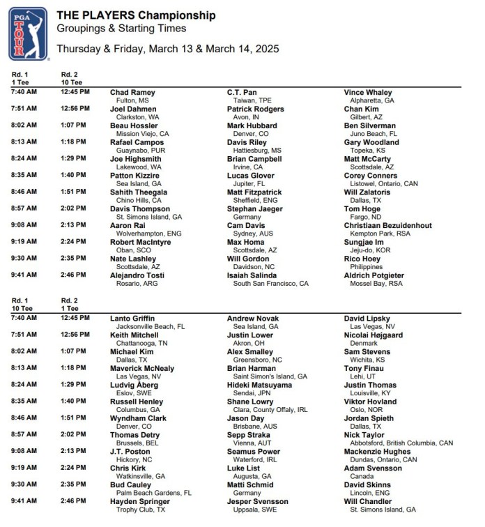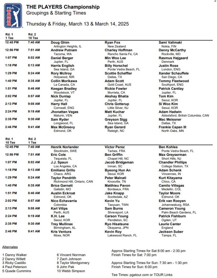 The Players Championship field is 144 players with the top 65 and ties making the weekend cut. Here are the tee times for the Thursday and Friday rounds:
