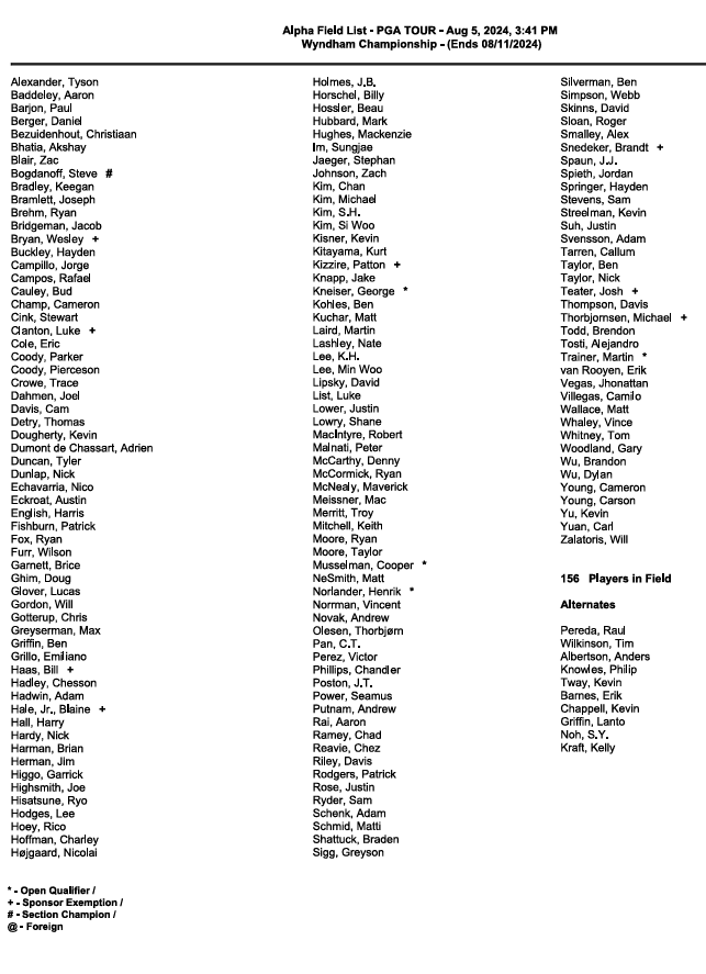 Here is the full field of 156 players for the Wyndham Championship courtesy of PGA Tour Communications: