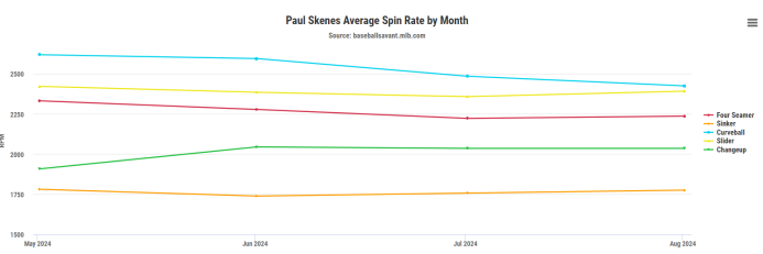 Skenes has seen some spin rate drops from where he was earlier in the season on his curveball and four-seam fastball.