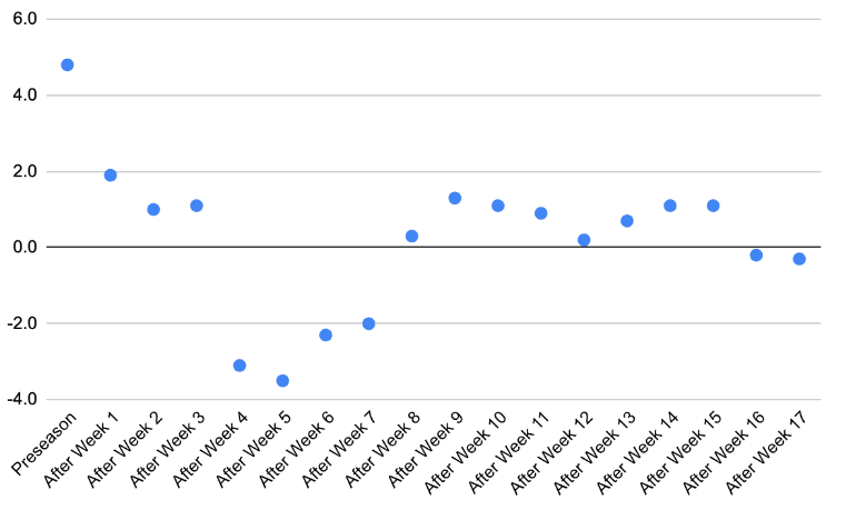Above, you’ll see the Bengals’ TSI rating as it fluctuated throughout the season. Coming off of a successful 2022, the Bengals were projected as one of the best teams in the NFL, only to see their TSI rating drop to New-York-Giants-Level bad by week 4, before rebounding decently well and staying around league average the rest of the way.