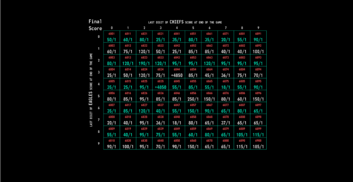 Using the example above of NFC 7, AFC 3 for the first quarter, that paid 9/1 for Super Bowl LVIII between the 49ers and Chiefs. AFC 7, NFC 3 also paid 9/1. NFC 7, AFC 0 paid +575. Other highly unlikely combinations, like NFC 2, AFC 9 paid 2000/1. Much like traditional squares, it is based on the last digit of a team’s score.