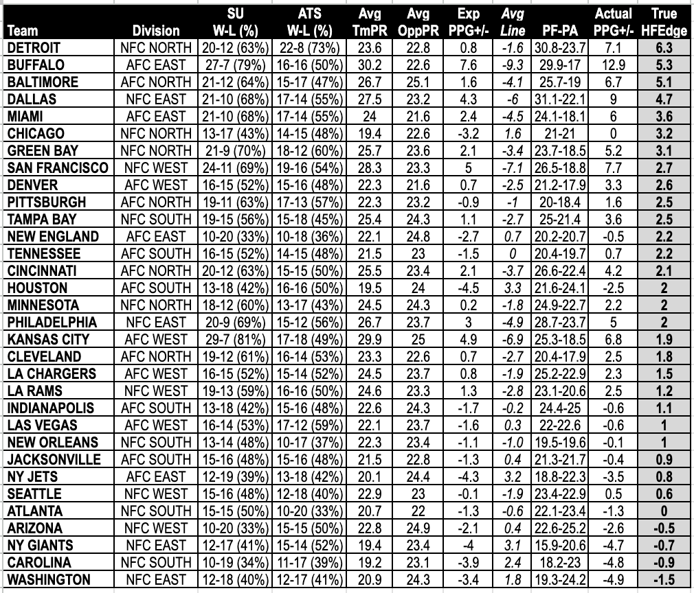 Here’s the list of all 32 NFL teams and their home-field performance on the chart below. They are sorted in order of TRUE HOME-FIELD ADVANTAGE rating.