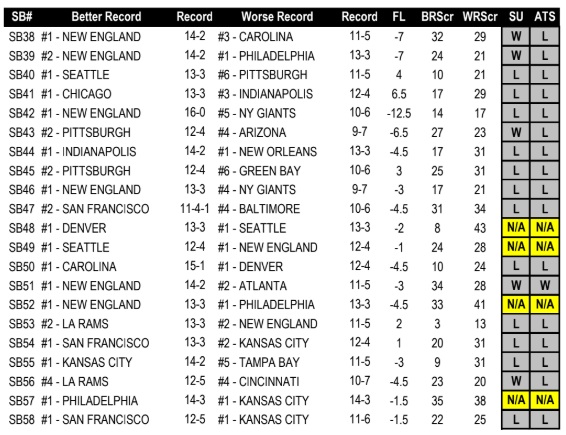 * The team that is the better playoff seed is just 2-16-2 ATS (11.1%) in the last 27 Super Bowl games! Note, in 2011, 2014, 2015, 2016, 2018, 2019, 2022 and 2023, equal seeds matched up. The 2025 finds No. 1 Kansas City taking on No. 2 Philadelphia.