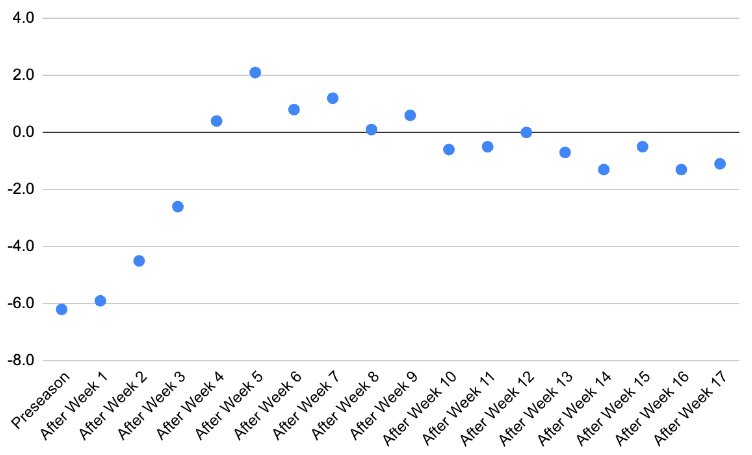 The Colts finished the season with a winning record at 9-8, and also finished 9-8 ATS, so there wasn’t a major edge or trend in just blindly backing Minshew Mania, but they surpassed expectations, nonetheless. Going just 4-7 ATS as underdogs, Indianapolis seemed to primarily capitalize on the handful of games where they had a talent advantage, going 5-1 ATS as a favorite, which was best in the NFL.