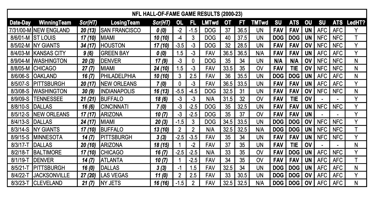 You’ll see a chart below that details the results of the Hall-of-Fame Games since 2000, complete with betting lines and totals. These games are played at Canton, OH, on a neutral field, thus the reason for the small favorite lines on average. Plus, the teams’ representative starters typically play no more than a single offensive series, resulting in lower totals.