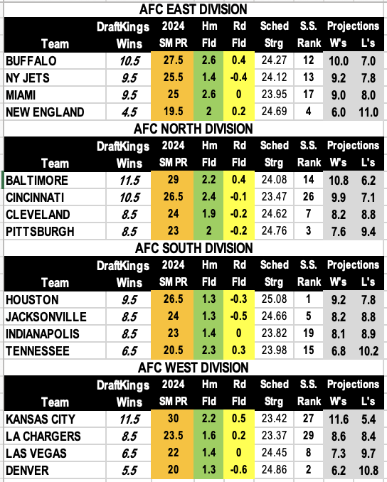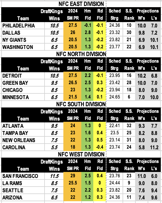 Here are a few highlights of the study, and some of my own observations based upon the season win totals offered by DraftKings Sportsbook as of May 29th. Hopefully, you’ve been following along with my weekly pieces over the last month in PSW as I’ve focused on teams expected to improve or decline in 2024 based on some of their statistical characteristics of last year. You’ll find a separate piece next week where I wrap up my NFL offseason work with a group of my favorite season-win total betting choices. Naturally, this week’s schedule piece also plays into those predictions.