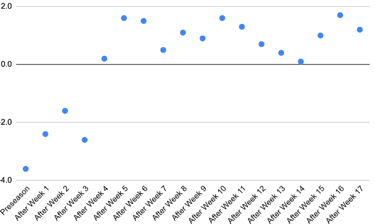 Above, you’ll see the Bucs’ TSI rating as it fluctuated throughout the season. What started as an abysmal power rating of almost 4 points below league average rapidly rocketed up and maintained above league average for the rest of the season.