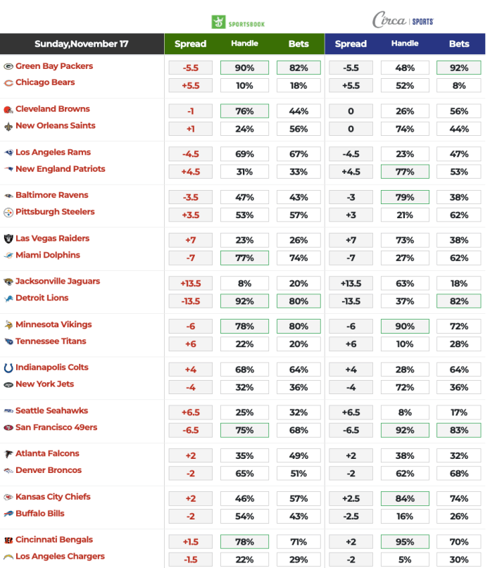 Pro Tip: Based on what we have seen so far, the Circa splits tend to be more volatile in the hour leading into kickoff than we saw with DK’s numbers. So you should keep an eye on them for late action.