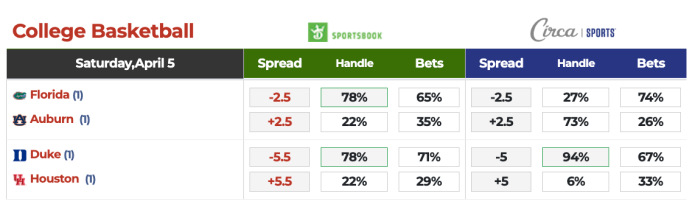 The Final Four is still days away, but let’s check in on the mid-week DraftKings/Circa Betting Splits.
