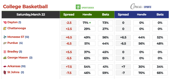 The deadline for the Circa College Hoops Challenge is 10 a.m. ET with six plays per contestant for the Saturday and Sunday second-round games. The picks will be posted here on VSiN.com shortly after the deadline. Texas pro handicapper Paul Stone leads the field of 15 handicappers with a 20-12 record (5-0 on Best Bets). Paul will join host Tim Murray on the VSiN Weekend Morning Line (10 a.m.-1 p.m. ET).