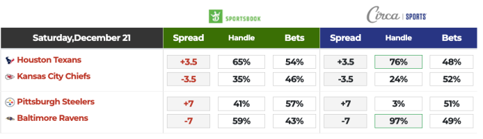 >DraftKings/Circa Betting Splits: At the top of this section, the chart shows a comparison of the betting splits from DraftKings and Circa Sports. Keep an eye on them this morning for late action.
