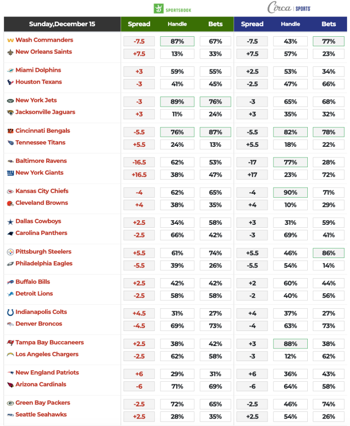 >DraftKings/Circa Betting Splits: The chart shows a comparison of the betting splits from DraftKings and Circa Sports. Keep an eye on them this morning for late action.