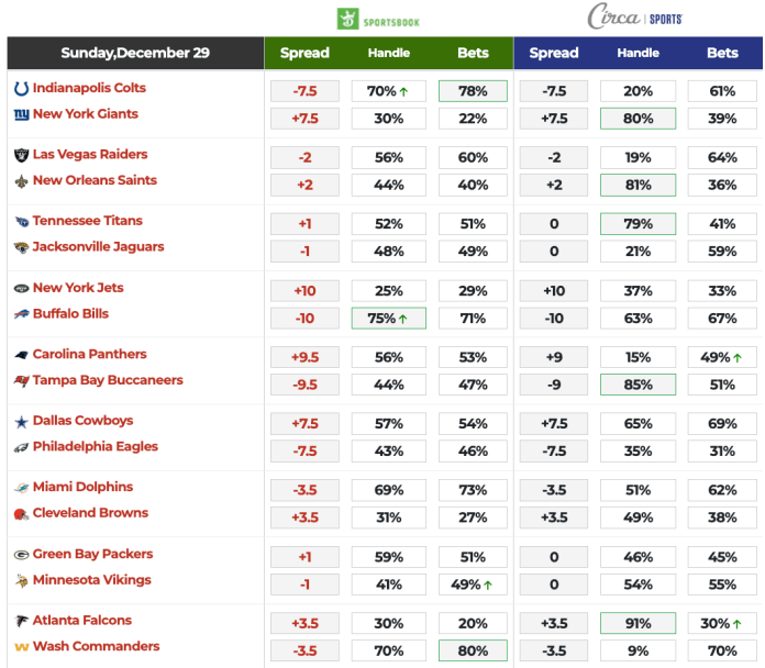 >DraftKings/Circa Betting Splits: At the top of this section, the chart shows a comparison of the betting splits from DraftKings and Circa Sports. Keep an eye on them this morning for late action.